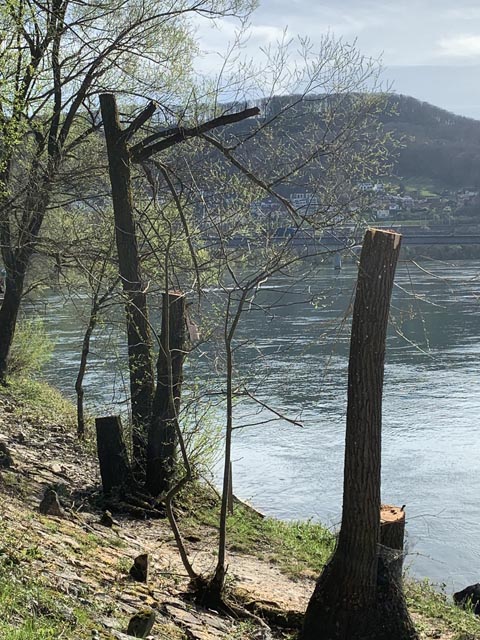 Am Steiner Rheinufer erfolgt die «Baumpflege» seit Jahren in wiederkehrenden Abständen als «Fäll-Aktionen» durch das Rheinkraftwerk. Dabei werden völlig überdimensionierte Maschinen eingesetzt, die für eine sorgfältige Baumpflege gar nicht geeignet sind. So werden dann entweder – hochstämmige, schattenspendende – Bäume kurzerhand ganz gefällt oder deren Kronen kurzerhand gekappt und nur noch die Stämme oder ein Baumstumpf belassen – siehe Bild. Kritisiert man das, wird einem entgegengehalten, diese Bäume würden dann wieder ausschlagen. Schattenspender sind diese Bäume dann aber nicht mehr.